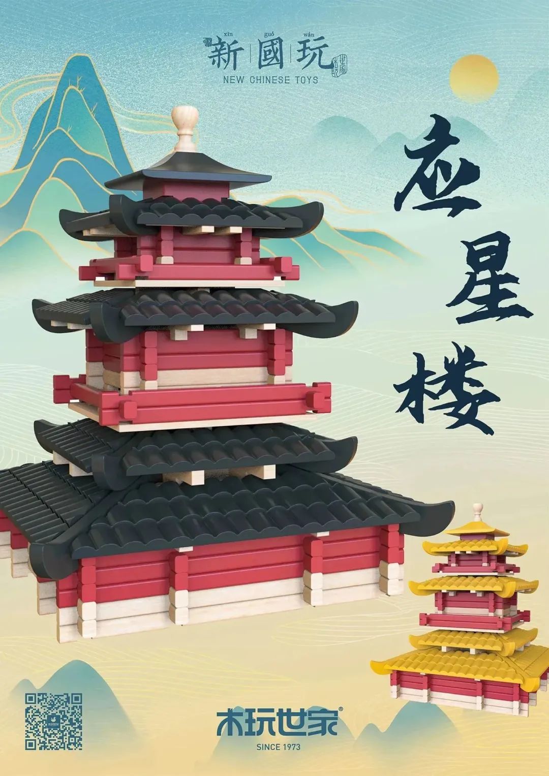 應(yīng)星樓,應(yīng)星而名,遙對“處士星”,為古處州千年歷史的見證。如今,應(yīng)時再建,舊名新顏,成為今麗水耀古爍今的標(biāo)志。在麗水本土特色產(chǎn)業(yè)的基礎(chǔ)之上,以積木玩具的形式來還原這座承載著處州的千年歷史的木構(gòu)建筑,寓教于樂,以此傳承麗水城市文脈并時刻喚起人們對歷史的回憶。應(yīng)星樓積木整體造型依照應(yīng)星樓建筑外觀設(shè)計,以榫卯結(jié)構(gòu)整合了各層建筑,去繁就簡,簡單的凹凸結(jié)合的連接方式凝練出應(yīng)星樓的整體木構(gòu)形象。每層屋頂配以繁密的青瓦和出挑的飛檐更顯精致,青、紅和原木的搭配傳承了中國傳統(tǒng)配色并保持了原木感。傳統(tǒng)和現(xiàn)代的碰撞使得這仿古建筑積木玩具妙趣橫生。